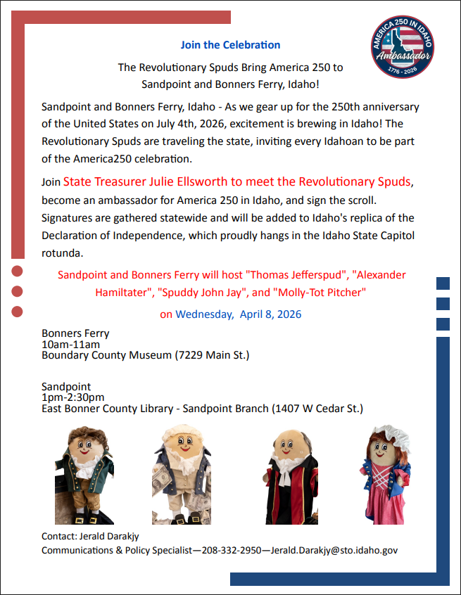The Revolutionary Spuds Bring America 250 to Bonners Ferry Wednesday, April 8, 2026 10:00 AM 11:00 AM Google Calendar ICS